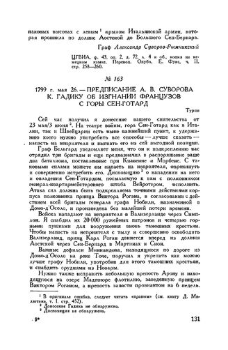 Предписание А.В. Суворова К. Гадику об изгнании французов с горы Сен-Готард. Турин. 1799 г. мая 26 // ЦГВИА, ф. 43, оп. 2, д. 53, лл. об. 15-16, копия на немецком языке. Перевод. Опубл. Е. Фукс, ч. II, стр. 260-263.