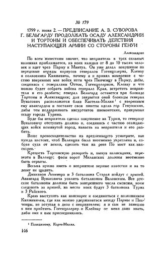 Предписание А.В. Суворова Г. Бельгарду продолжать осаду Александрии и Тортоны и обеспечивать действия наступающей армии со стороны Генуи. Александрия. 1799 г. июня 2 // ЦГВИА, ф. 43, оп. 2, д. 25, лл. 92-93, черновик. Копия на немецком языке хранится в деле № 34, лл. 12-13. Опубл. Д. Милютин, т. III, стр. 284, и Е. Фукс, ч. II, стр. 298-300.