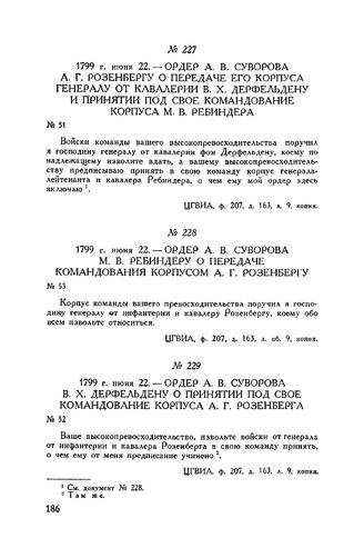 Ордер А.В. Суворова А.Г. Розенбергу о передаче его корпуса генералу от кавалерии В.X. Дерфельдену и принятии под свое командование корпуса М.В. Ребиндера. 1799 г. июня 22 // ЦГВИА, ф. 207, д. 163, л. 9, копия.