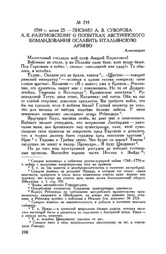 Письмо А.В. Суворова А.К. Разумовскому о попытках австрийского командования ослабить итальянскую армию. Александрия. 1799 г. июня 25 // ЦГВИА, ф. 207, д. 60, лл. об. 5-6 и об., копия без подписи. Опубл. с пропусками Е. Фукс, ч. II, стр. 472-475 и в «Военном журнале», 1811, кн. 10, стр. 60-62.