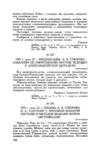 А.В. Суворов: Сб. док в 4 т. Т. IV. 1799-1800. — М.: Воениздат, 1953.