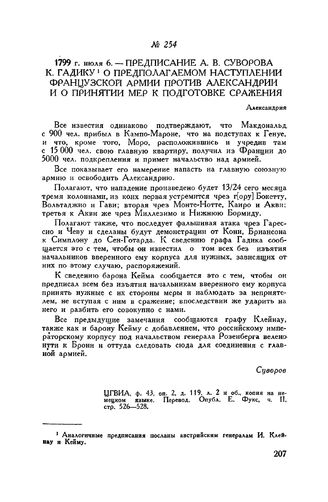 Предписание А.В. Суворова К. Гадику о предполагаемом наступлении французской армии против Александрии и о принятии мер к подготовке сражения. Александрия. 1799 г. июля 6 // ЦГВИА, ф. 43, оп. 2, д. 119, л. 2 и об., копия на немецком языке. Перевод. Опубл. Е. Фукс, ч. II, стр. 526-528.