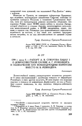 Рапорт А.В. Суворова Павлу I о добросовестной службе А.Г. Розенберга и назначении его командующим корпусом вместо М.В. Ребиндера. Александрия. 1799 г. июля 8 // Архив ВПР МИД СССР, ф. «Сношения России с Францией», д. 1391, л. 36, подлинник.