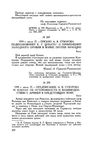 Предписание А.В. Суворова И. Кленау об осторожности и взаимодействии с армией в предстоящих боях. Боско. 1799 г. июля 17 // ЦГВИА, ф. 43, оп. 2, д. 119, лл. 11-12, копия на немецком языке. Перевод. Опубл. Е. Фукс, ч. II, стр. 603-604.