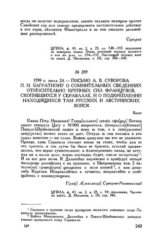 Письмо А.В. Суворова П.И. Багратиону о сомнительных сведениях относительно крупных сил французов, скопившихся у Серавалле, и о подкреплении находящихся там русских и австрийских войск. Боско. 1799 г. июля 24 // ЦГВИА, ф. 43, оп. 2, д. 28, л. 10, подлинник. Частично опубл. Д. Милютин, т. III, стр. 345.