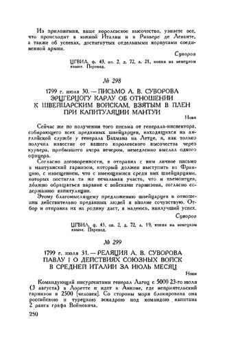 Реляция А.В. Суворова Павлу I о действиях союзных войск в Средней Италии за июль месяц. Нови. 1799 г. июля 31 // ЦГВИА, ф. 26, оп. 152, д. 532, лл. 77-78 об., подлинник. Опубл. с некоторыми отступлениями от текста подлинника Е. Фукс, ч. II, стр. 690-692.