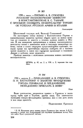Письмо А.В. Суворова русскому полномочному министру в Константинополе В.С. Тамаре с просьбой сообщить правительству Турции об успехах русской армии в Италии. Александрия. 1799 г. июль