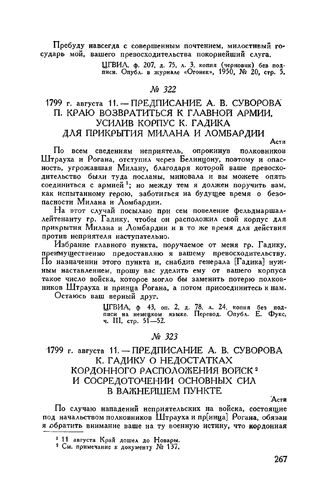 Предписание А.В. Суворова К. Гадику о недостатках кордонного расположения войск и сосредоточении основных сил в важнейшем пункте. Асти. 1799 г. августа 11 // ЦГВИА, ф. 43, оп. 2, д. 90, л. 35 и об., черновик без подписи на немецком языке. Перевод взят из книги Д. Милютина, т. III, стр. 379. Опубл. в сборнике «Генералиссимус Суворов», стр. 272-273 и Е. Фукс, ч. III, стр. 52-53.