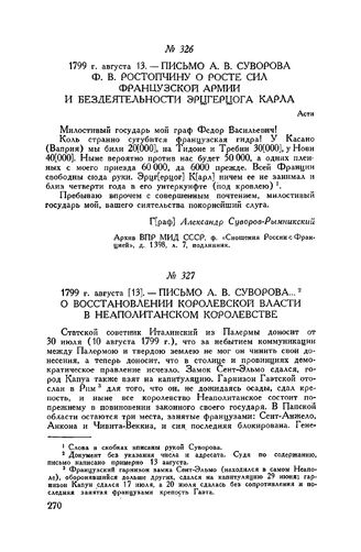 Письмо А.В. Суворова Ф.В. Ростопчину о росте сил французской армии и бездеятельности эрцгерцога Карла. Асти. 1799 г. августа 13 // Архив ВПР МИД СССР, ф. «Сношения России с Францией», д. 1398, л. 7, подлинник.
