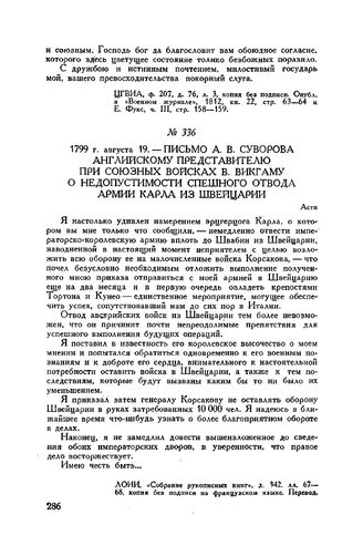 Письмо А.В. Суворова английскому представителю при союзных войсках В. Викгаму о недопустимости спешного отвода армии Карла из Швейцарии. Асти. 1799 г. августа 19 // ЛОИИ, «Собрание рукописных книг», д. 342. лл. 67-68, копия без подписи на французском языке. Перевод.
