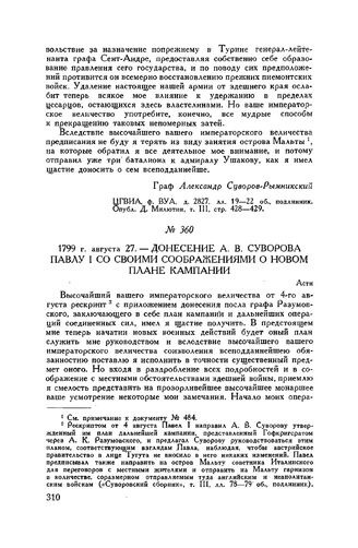 Донесение А.В. Суворова Павлу I со своими соображениями о новом плане кампании. Асти. 1799 г. августа 27 // ЦГВИА, ф. ВУА, д. 2827, лл. 23-26, подлинник. Частично опубл. в сборнике «Генералиссимус Суворов», стр. 288-289, полностью — Д. Милютин, т. III, стр. 427-428.