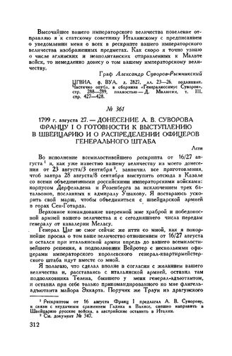 Донесение А.В. Суворова Францу I о готовности к выступлению в Швейцарию и о распределении офицеров генерального штаба. Асти. 1799 г. августа 27