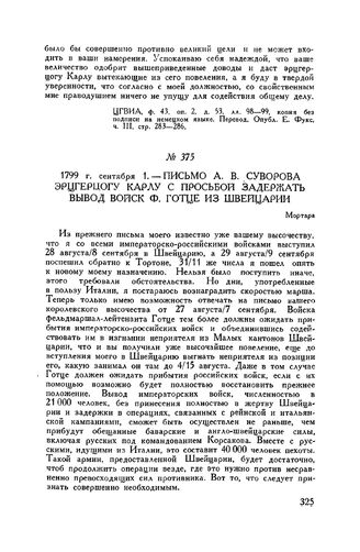 Письмо А.В. Суворова эрцгерцогу Карлу с просьбой задержать вывод войск Ф. Готце из Швейцарии. Мортара. 1799 г. сентября 1 // ЦГВИА, ф. 43, оп. 2, д. 72, лл. 38-39, копия без подписи на немецком языке. Перевод. Опубл. Е. Фукс, ч. III, стр. 282-283.