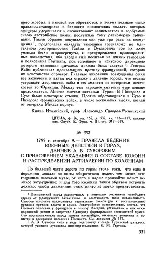 Правила ведения военных действий в горах, данные А.В. Суворовым, с приложением указаний о составе колонн и распределении артиллерии по колоннам. 1799 г. сентября 9
