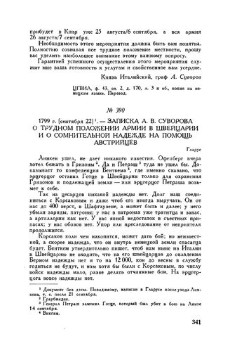 Записка А.В. Суворова о трудном положении армии в Швейцарии и о сомнительной надежде на помощь австрийцев. Гларус. 1799 г. [сентября 22] // ЦГВИА, ф. 43, оп. 2, д. 28, л. 21 и об., копия бее подписи. Опубл. Д. Милютин, т. III, стр. 521.