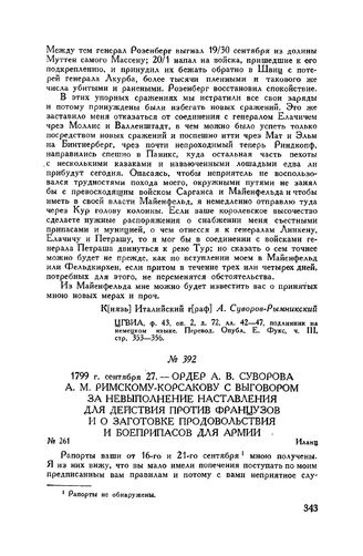 Ордер А.В. Суворова А.М. Римскому-Корсакову с выговором за невыполнение наставления для действия против французов и о заготовке продовольствия и боеприпасов для армии. Иланц. 1799 г. сентября 27 // ЦГВИА, ф. 207, д. 163, лл. об. 49-50, копия.