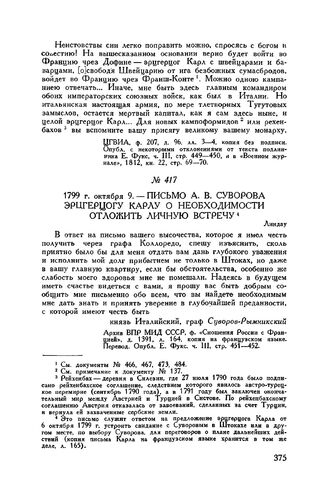Письмо А.В. Суворова эрцгерцогу Карлу о необходимости отложить личную встречу. Линдау. 1799 г. октября 9 // Архив ВПР МИД СССР, ф. «Сношения России с Францией», д. 1391, л. 164, копия на французском языке. Перевод. Опубл. Е. Фукс, ч. III, стр. 451-452.