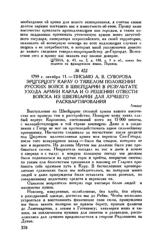 Письмо А.В. Суворова эрцгерцогу Карлу о тяжелом положении русских войск в Швейцарии в результате ухода армии Карла и о решении отвести войска из Швейцарии для лучшего расквартирования. Линдау. 1799 г. октября 11 // ЦГВИА, ф. 43, оп. 2, д. 72, лл. 52-53, черновик без подписи на немецком языке. Перевод взят из книги Д. Милютина, т. III, стр. 540-541. Опубл. Е. Фукс, ч. III, стр. 452-454.