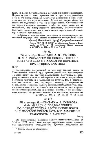 Ордер А.В. Суворова В.X. Дерфельдену по поводу решения военного суда о наказании портупей-прапорщика Елютина. 1799 г. октября 17 // ЦГВИА, ф. 207, д. 163, лл. об. 59-60, копия.