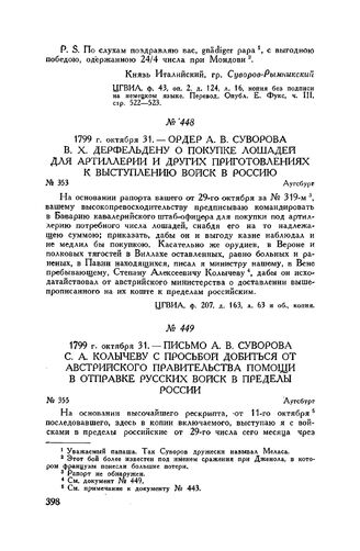 Ордер А.В. Суворова В.X. Дерфельдену о покупке лошадей для артиллерии и других приготовлениях к выступлению войск в Россию. Аугсбург. 1799 г. октября 31 // ЦГВИА, ф. 207, д. 163, л. 63 и об., копия.
