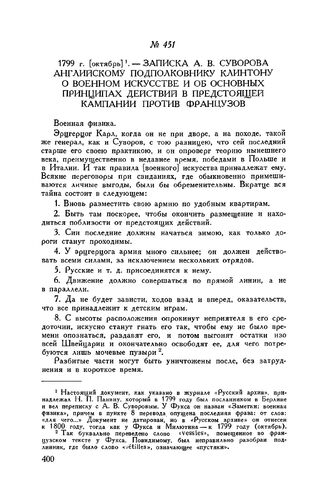 Записка А.В. Суворова английскому подполковнику Клинтону о военном искусстве и об основных принципах действий в предстоящей кампании против французов. 1799 г. [октябрь] // Журнал «Русский архив», 1879 г., кн. 1, стр. 267-268. Текст на французском языке и перевод с него. Опубл. с некоторыми пропусками Е. Фукс, ч. III, стр. 455-458. Один французский текст опубл. по Фуксу Д. Милютин, т. III, стр. 537.
