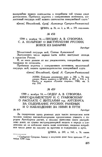 Письмо А.В. Суворова С.А. Колычеву о выступлении русских войск из Баварии. Аугсбург. 1799 г. ноября 14 // ЛОИИ, собрание рукописных книг, д. 342, л. 70, подлинник. Копия хранится в ЦГВИА, ф. 207, д. 114, л. 3. Опубл. в журнале «Русская старина», 1900, кн. 5, стр. 318.