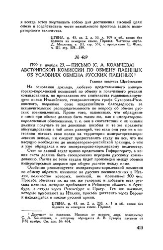 Письмо [С.А. Колычева] австрийской комиссии по обмену пленных об условиях обмена русских пленных. Главная квартира Шробенгаузен. 1799 г. ноября 23 // ЦГВИА, ф. 43, оп. 2, д. 203, л. 1 и об., копия без подписи на немецком языке. Перевод.