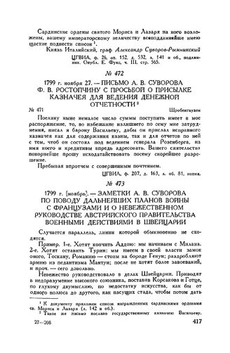 Заметки А.В. Суворова по поводу дальнейших планов войны с французами и о невежественном руководстве австрийского правительства военными действиями в Швейцарии. 1799 г. [ноябрь] // Архив ВПР МИД СССР, ф. «Сношения России с Францией», д. 1398, лл. 56-57, копия без подписи на французском языке. Перевод взят из книги Е. Фукса, ч. III, стр. 578-583.