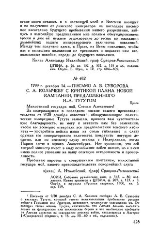 Письмо А.В. Суворова С.А. Колычеву с критикой плана новой кампании, предложенного И.-А. Тугутом. Прага. 1799 г. декабря 14 // ЛОИИ, собрание рукописных книг, д. 342, л. 80, подлинник. Копия хранится в ЦГВИА, ф. 207, д. 123, л. 3. Опубл. в журнале «Русская старина», 1900, кн. 5, стр. 319.
