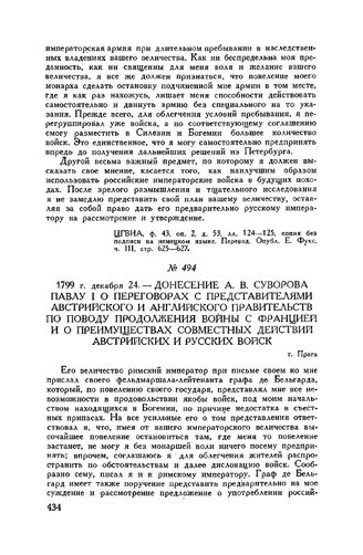 Донесение А.В. Суворова Павлу I о переговорах с представителями австрийского и английского правительств по поводу продолжения войны с Францией и о преимуществах совместных действий австрийских и русских войск. Прага. 1799 г. декабря 24 // ЦГВИА, ф. 26, оп. 152, д. 532, лл. 156-159, подлинник. Опубл. Д. Милютин, т. III, стр. 631-632.