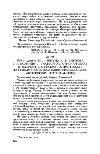 Письмо А.В. Суворова С.А. Колычеву с просьбой о срочной отсылке в Петербург его письма на имя Павла I по поводу плана кампании, предлагаемого австрийским правительством. 1799 г. [декабря 24]