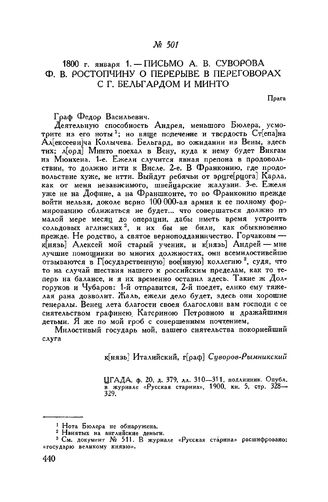 Письмо А.В. Суворова Ф.В. Ростопчину о перерыве в переговорах с Г. Бельгардом и Минто. Прага. 1800 г. января 1 // ЦГАДА, ф. 20, д. 379, лл. 310-311, подлинник. Опубл. в журнале «Русская старина», 1900, кн. 5, стр. 328-329.