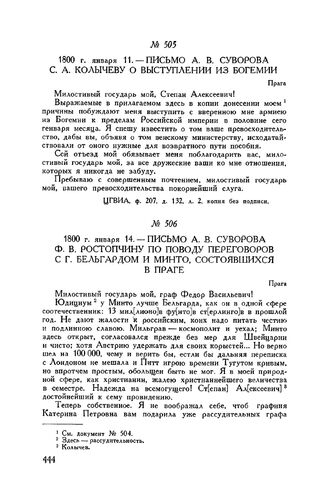 Письмо А.В. Суворова Ф.В. Ростопчину по поводу переговоров с. Г. Бельгардом и Минто, состоявшихся в Праге. Прага. 1800 г. января 14 // ЦГАДА, ф. 20, д. 379, л. 313 и об., подлинник. Копия хранится в ЦГВИА, ф. 207, д. 133, л. 3 и об.