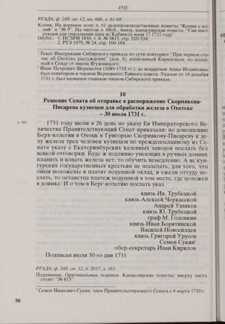 Решение Сената об отправке в распоряжение Скорнякова-Писарева кузнецов для обработки железа в Охотске. 30 июля 1731 г. // РГАДА, ф. 248, оп. 32, д. 2017, л. 163.