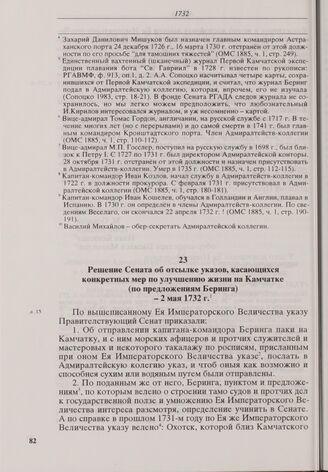Решение Сената об отсылке указов, касающихся конкретных мер по улучшению жизни на Камчатке (по предложениям Беринга). 2 мая 1732 г. // РГАДА, ф. 248, оп. 32. кн. 2026 (Реестр крепленым протоколам Сената за май 1732 г.), л. 15-18. ПСЗРИ, 1830, т. 8, № 6041, стр. 770-774.