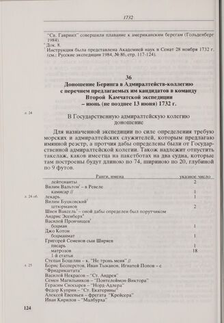 Доношение Беринга в Адмиралтейств-коллегию с перечнем предлагаемых им кандидатов в команду Второй Камчатской экспедиции. Июнь (не позднее 13 июня) 1732 г. // РГАВМФ, ф. 216, оп. 1, д. 1, л. 24-26.