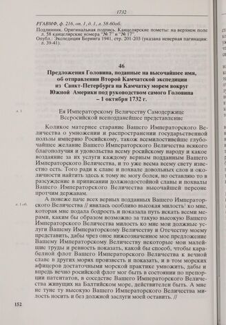 Предложения Головина, поданные на высочайшее имя, об отправлении Второй Камчатской экспедиции из Санкт-Петербурга на Камчатку морем вокруг Южной Америки под руководством самого Головина. 1 октября 1732 г.