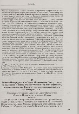 Ведение Петербургского Сената Московскому Сенату о выдаче жалования и подвод игумену Филевскому и его спутникам, отправляющимся на Камчатку для миссионерской работы. 3 октября 1732 г.