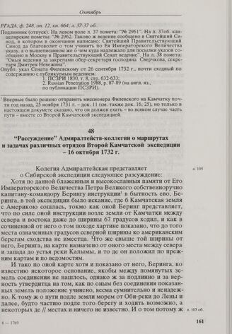 Рассуждение Адмиралтейств-коллегии о маршрутах и задачах различных отрядов Второй Камчатской экспедиции. 16 октября 1732 г. // РГАДА, ф. 248, оп. 12, кн. 666, л. 105-109об. РТЭ, 1979, стр. 169-171; Русские экспедиции, 1984, № 84, стр. 116; Russian Penetration, 1988, № 22, р. 96-100.