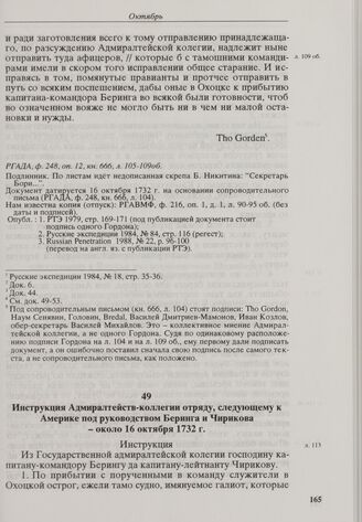 Инструкция Адмиралтейств-коллегии отряду, следующему к Америке под руководством Беринга и Чирикова. Около 16 октября 1732 г. // РГАДА, ф. 248, оп. 12, кн. 666, л. 113-114об. РТЭ, 1979, стр. 172-173; Русские экспедиции, 1984, № 85, стр. 117; Russian Penetration, 1988, № 23, р. 101-103.