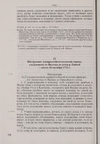 Инструкция Адмиралтейств-коллегии отряду, следующему от Якутска до устья р. Енисей. Около 16 октября 1732 г. // РГАДА, ф. 248, оп. 12, кн. 666, л. 119-120об.