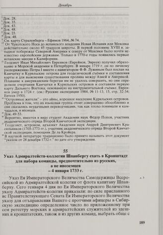 Указ Адмиралтейств-коллегии Шпанбергу ехать в Кронштадт для набора команды, предпочтительно из русских, а не иноземцев. 4 января 1733 г. // РГАВМФ, ф. 216, оп.1I, д. 2, л. 3-4.