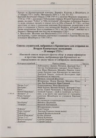 Список служителей, набранных в Кронштадте для отправки во Вторую Камчатскую экспедицию. 20 января 1733 г. // РГАВМФ, ф. 216, оп. 1, д.1, л. 243-244об. РТЭ, 1979, № 31, стр. 174-176.