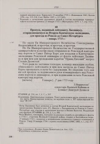 Пропуск, выданный лейтенанту Лассиниусу, отправляющемуся во Вторую Камчатскую экспедицию, для проезда из Ревеля до Санкт-Петербурга. Январь 1733 г. // РГАВМФ, ф. 216, оп. 1, д. 1, л. 507.
