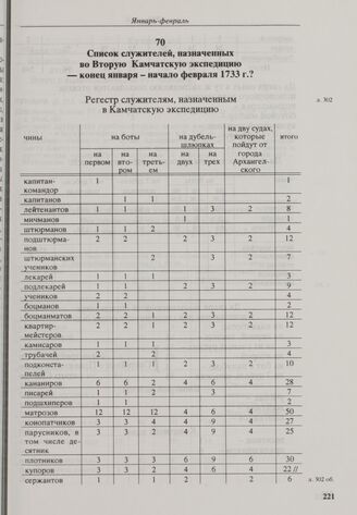 Список служителей, назначенных во Вторую Камчатскую экспедицию. Конец января - начало февраля 1733 г. // РГАВМФ, ф. 216, оп. 1, д. 1, Л. 302-303.