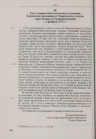 Указ Адмиралтейств-коллегии о следовании Камчатской экспедиции до Твери посуху, а оттуда через Казань до Соликамска водой. 2 февраля 1733 г. // РГАВМФ, ф. 216, оп. 1, д. 1, л. 441-442.