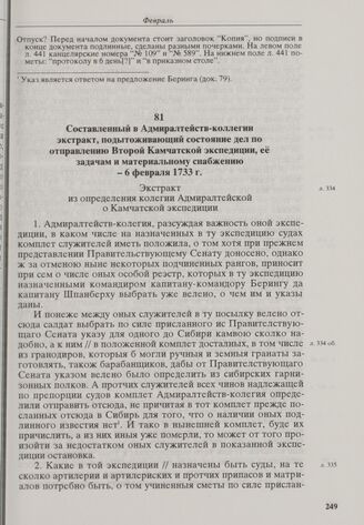 Составленный в Адмиралтейств-коллегии экстракт, подытоживающий состояние дел по отправлению Второй Камчатской экспедиции, ее задачам и материальному снабжению. 6 февраля 1733 г. // РГАДА, ф. 248, оп. 12, кн. 666, л. 334-349об.