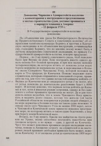 Доношение Чирикова в Адмиралтейств-коллегию с комментариями к инструкциям и предложениями о местах строительства судов, доставке провианта и о маршруте плавания к Америке. 12 февраля 1733 г. // РГАВМФ, ф. 216, оп. 1, д. 11, л. 637-640. Экспедиция Беринга, 1941, стр. 205-208; РТЭ, 1979, № 32, стр. 177-179; Русские экспедиции, 1984, № 92, стр. 135-136.