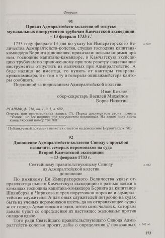 Приказ Адмиралтейств-коллегии об отпуске музыкальных инструментов трубачам Камчатской экспедиции. 13 февраля 1733 г.
