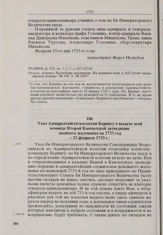 Указ Адмиралтейств-коллегии Берингу о выдаче всей команде Второй Камчатской экспедиции двойного жалования на 1733 год. 23 февраля 1733 г. // РГАВМФ, ф. 216, оп. 1, д. 1, л. 699-699об.